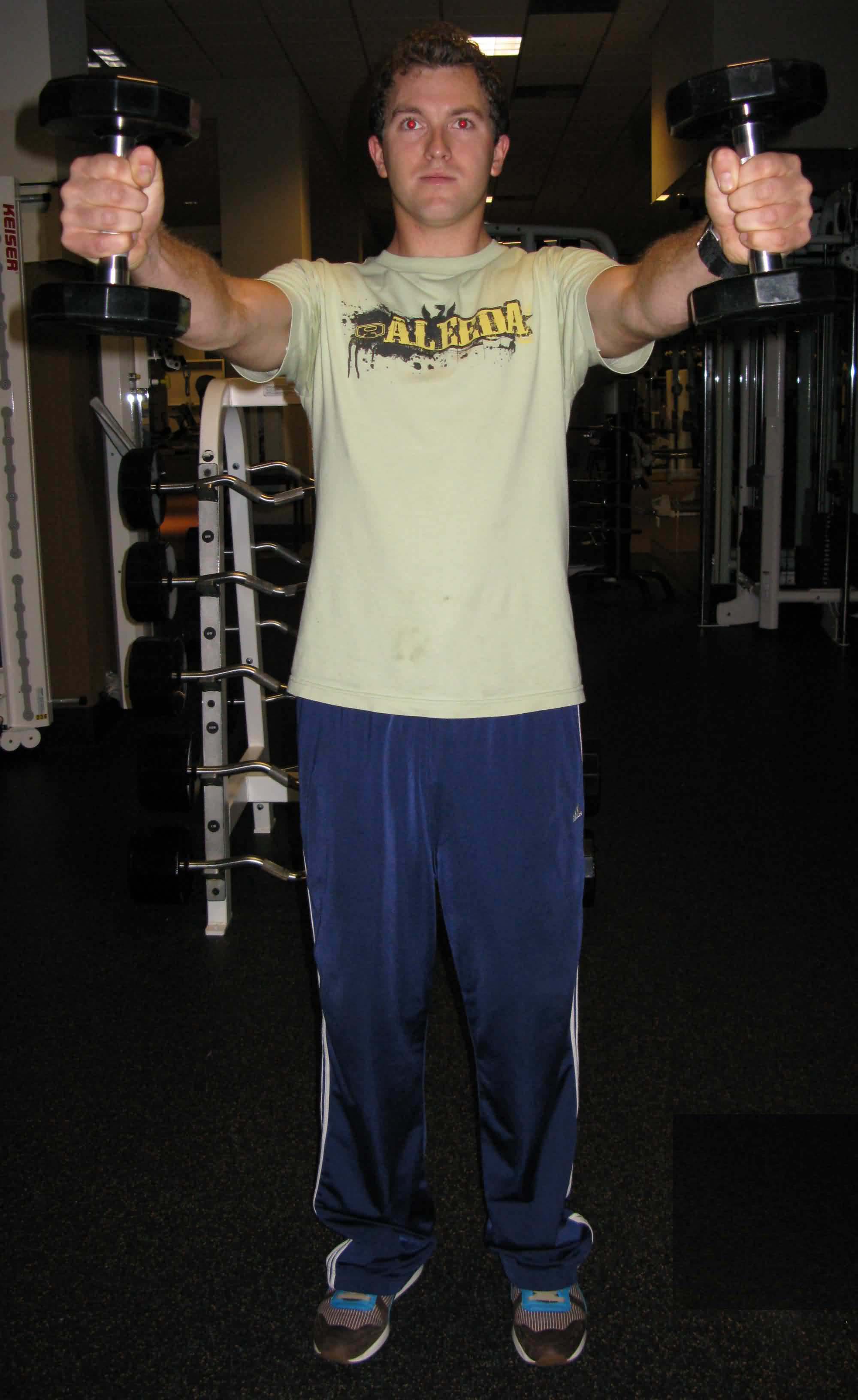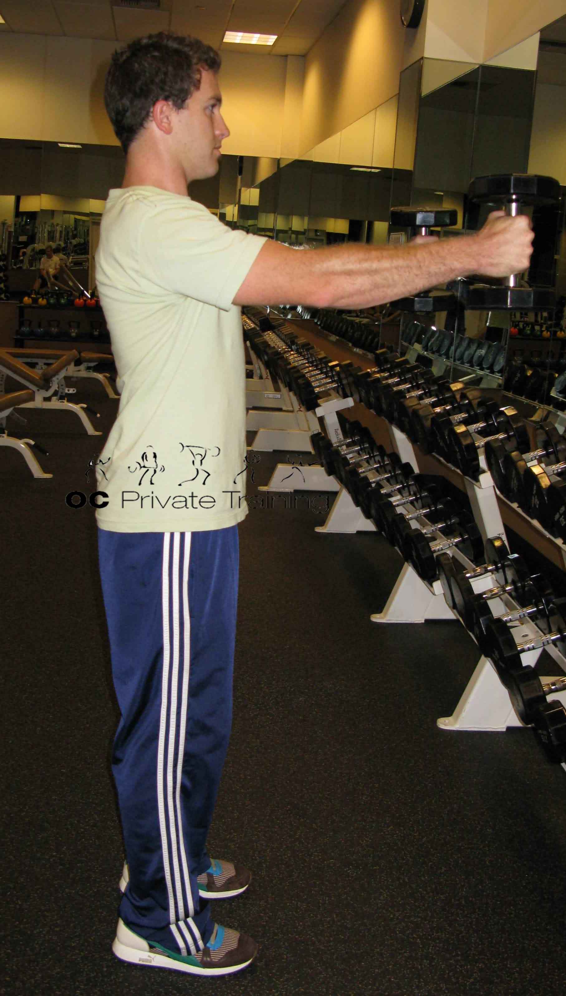 Lift arms to the front until they are parallel with floor, no higher than your shoulders.