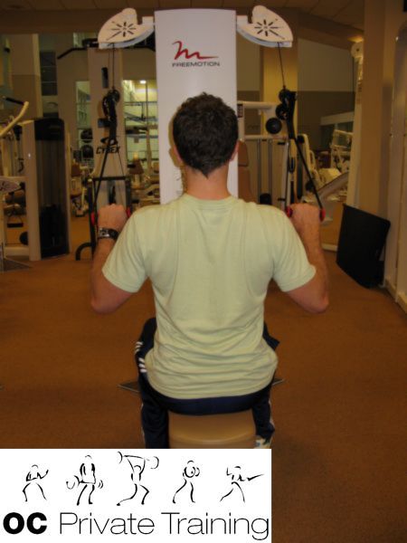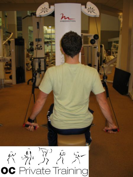 As your arm lower, be sure to maintain a anchored squeeze with your shoulder blades. Keep the cable handle and your hands slightly wider than shoulder width.