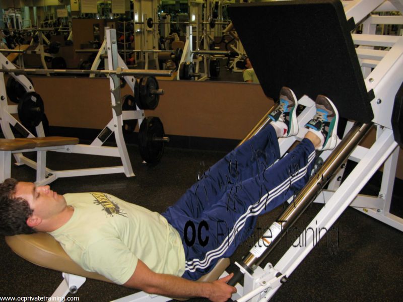 Keeping legs straight, but not locked, press your toes into the foot plate.