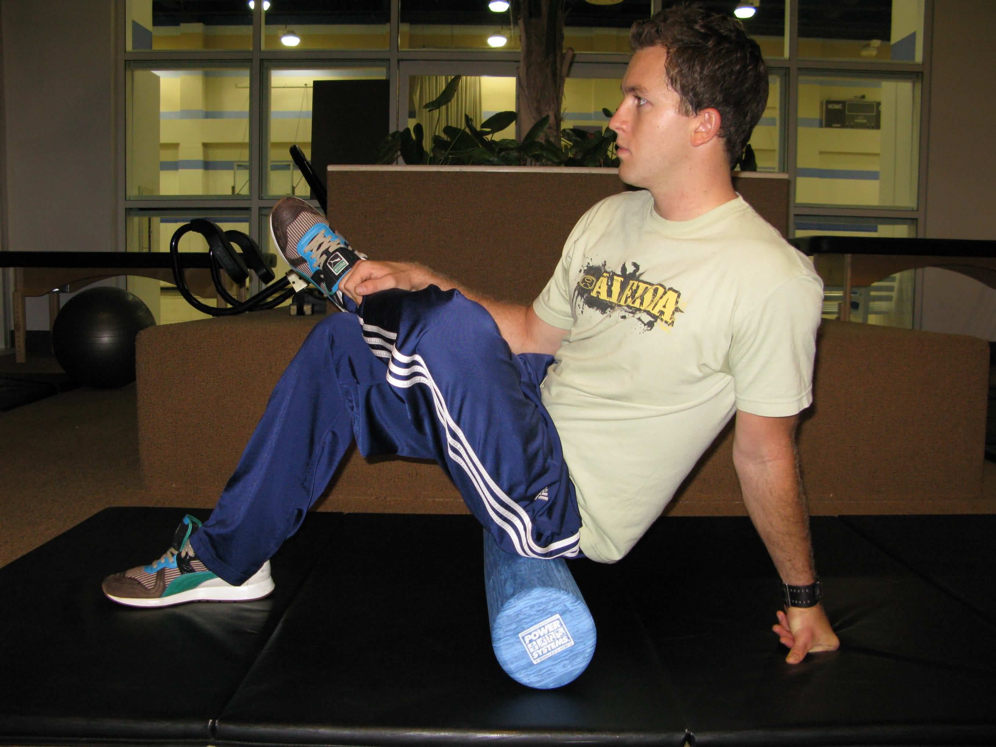 Sit on your butt on top the foam roll crossing a leg over the opposite as shown.