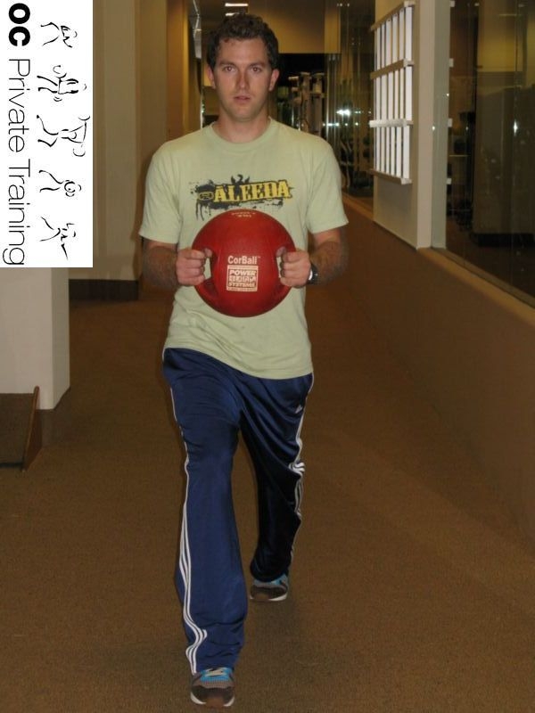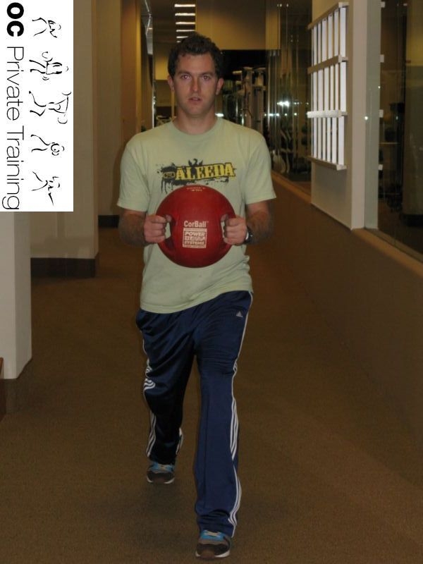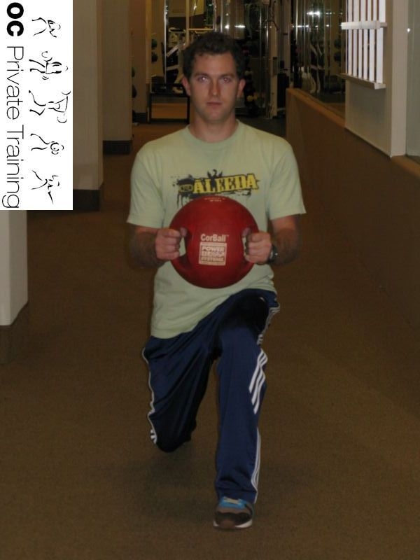 While maintaining optimal spinal alignment, step forward and descend slowly by bending at the hips, knees and ankles.