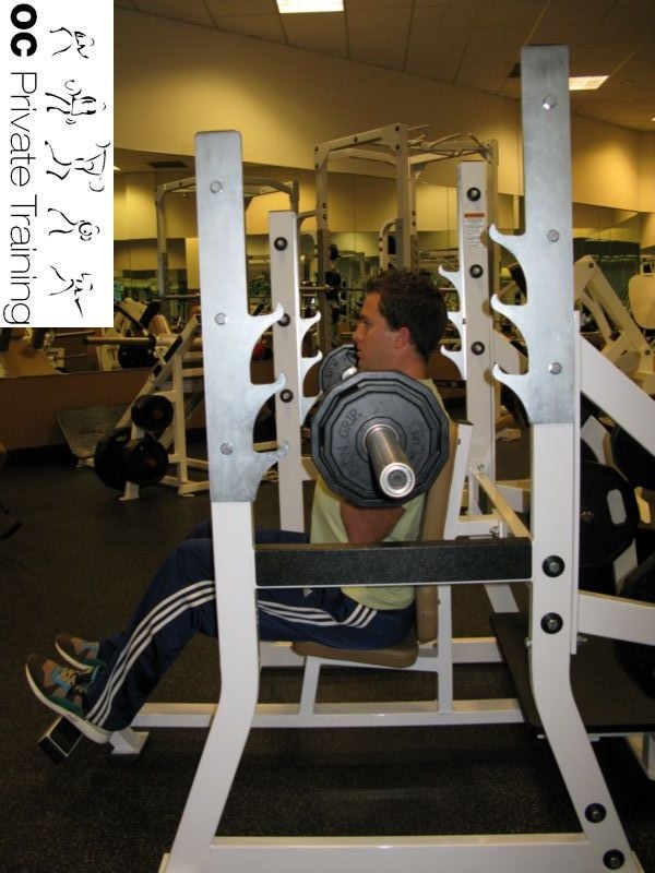 Seated on a bench, sit with your spine tall as possible with your belly squeezed tightly the entire time.