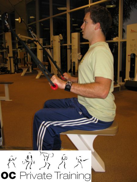 As your arm lower, be sure to maintain a anchored squeeze with your shoulder blades. Keep the cable handle and your hands slightly wider than shoulder width.