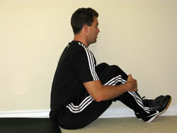 Begin by sitting sideways inches from any solid wall. Tuck your knees into your chest.